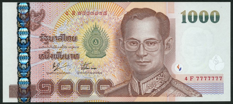 (x) Bank of Thailand, 1000 baht, ND (1992), serial number 4F 7777777, brown and multicoloured, King Rama IX at right