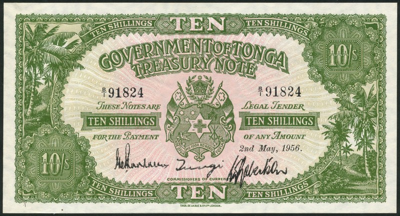 Government of Tonga, 4 shillings, 29 July 1964, predix D/1, brown, also 10 shillings, 2 May 1956, prefix B/1, green, both arms at centre, three printed signatures below