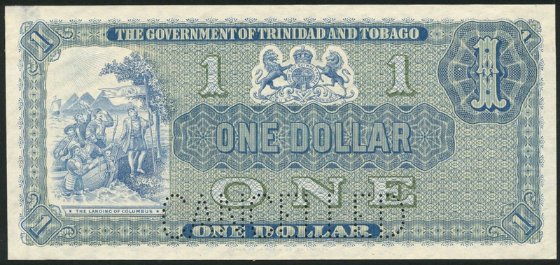(†) The Government of Trinidad & Tobago, specimen $1, ND (1905-26), no serial numbers, no signatures, blue, landing of Columbus at left, arms at upper centre, value in guilloche at upper right, reverse vignette of mountain and sailing ships at centre, value at left and right, perforated CANCELLED