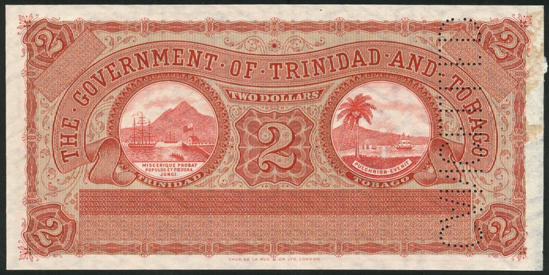 (†) The Government of Trinidad & Tobago, specimen $2, ND (1905), no serial numbers, no signatures, red, mountain and sailing ships at left, value at centre, palm tree and ship at right, reverse cocoa field at left, arms at centre, cane field at lower right, perforated CANCELLED