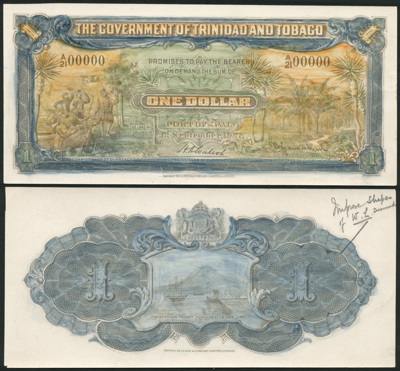 (†) The Government of Trinidad & Tobago, obverse and reverse hand coloured photographic style proofs for a $1, 1 September 1927, serial number A/21 00000, blue on yellow-orange and pale green underprint, landing of Columbus at left, palm trees at right, reverse blue, vignette of mountain and sailing ships at centre, value at left and right, arms at upper centre