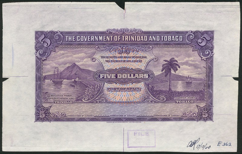 (†) The Government of Trinidad & Tobago, a large format specimen proof $5, ND (c1940), no serial numbers, no signatures, purple on multicoloured underprint, ship, harbour and mountain at left, value at centre, palm tree and coastal scenery at right, reverse arms at centre, value at left and right