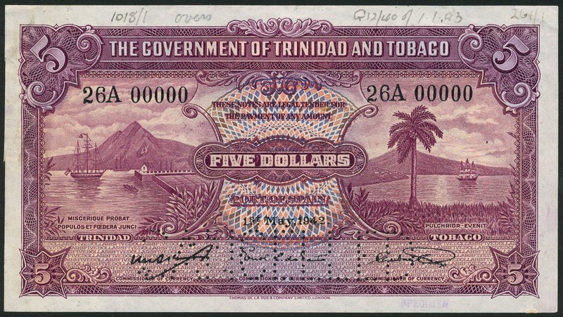 (†) The Government of Trinidad & Tobago, specimen $5 (2), 1 May 1942, serial number 26A 00000, and ND (c1940), no serial numbers, no signatures, both purple on multicoloured underprint, ship, harbour and mountain at left, value at centre, palm tree and coastal scenery at right, reverse arms at centre, value at left and right, the first only perforated CANCELLED