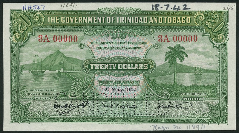 (†) The Government of Trinidad & Tobago, specimen $20, 1 May 1942, serial number 3A 00000, green on multicoloured underprint, ship, harbour and mountain at left, value at centre, palm tree and coastal scenery at right, reverse arms at centre, value at left and right, perforated CANCELLED