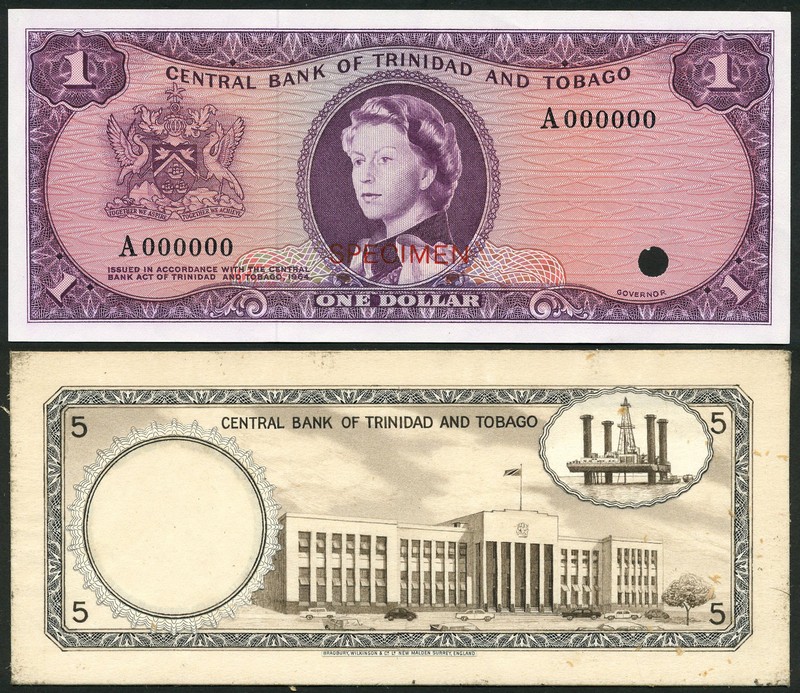(†) The Government of Trinidad & Tobago, specimen colour trial $1, Law of 1964, serial number A 000000, purple on multicoloured underprint, Annigoni portrait of Queen Elizabeth II at centre, arms at left, reverse Central Bank building at centre, oil rig at upper right, overprinted SPECIMEN in red on obverse and reverse, one punch hole; also reverse composite essay on card for $5, Law of 1964, black and brown, Central Bank building at centre, oil rig (used on $1) at upper right