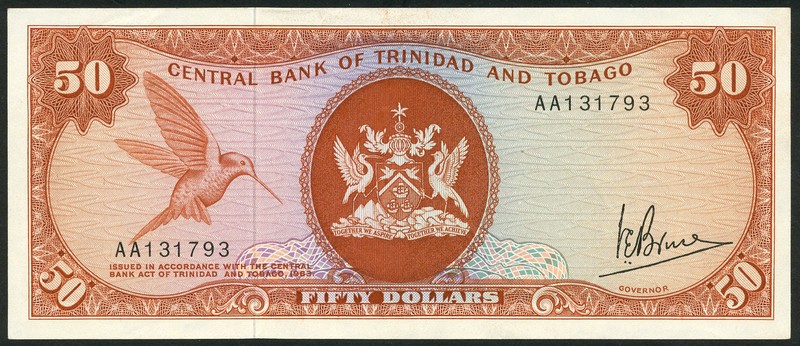 Central Bank of Tinidad and Tobago, $50, ND (1977), serial number AA 131793, brown and multicoloured, arms at centre, long billed starthroat at left, Bruce signature, error date 1963, reverse brown, bank building at centre, net fishing top right