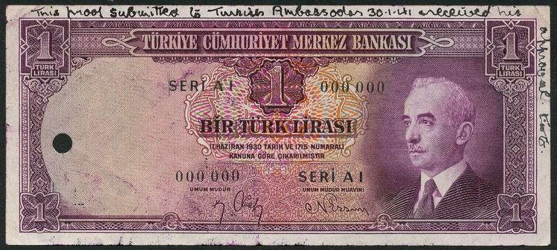 (†) Central Bank of Turkey, specimen 50 Kurus, Law of 1930, Seri A25, serial number 000000; and issued 50 Kurus, Law of 1930, Seri A11, serial number 126562, both dark brown on multicoloured underprint, portrait of President Ismet Inonu at right, reverse building; also specimen 1 Lira, Law of 1930, Seri A1, serial number 000000, lilac, President Ismet Inonu at right, reverse the Bosporus Strait, one punch hole