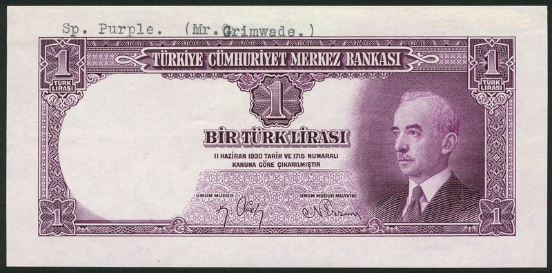 (†) Central Bank of Turkey, a group of uniface stage proofs (6) for a 1 Lira, Law of 1930 (1942), comprising obverse in purple, portrait of President Ismet Inonu at right; reverse in purple, vignette of Bosporus Strait; three obverse proofs with underprint and guilloche in three different colour combinations; also reverse proof on watermarked paper with blue and orange underprint only