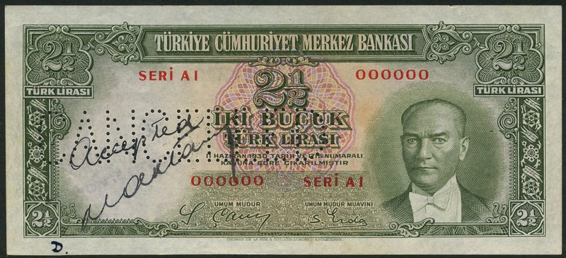 (†) Central Bank of Turkey, specimen 2 ½ Lira (2), Law of 1930 (1939) Seri A1 and Seri 00, both zero serial numbers, olive-green and multicoloured, portrait of Kemal Ataturk at right, reverse Monument of the Square of the Nation, one perforated CANCELLED, the other overprinted SPECIMEN in red with one black specimen De La Rue oval on obverse