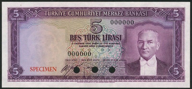 (†) Central Bank of Turkey, specimen colour trial 5 Lira, Law of 1930 (1951-60), zero serial numbers, lilac, portrait of Kemal Ataturk at right, reverse women with baskets of hazel nuts, overprinted SPECIMEN in red on obverse and reverse