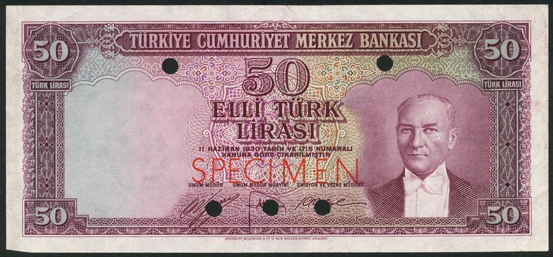 Central Bank of Turkey, specimen 50 lira, law of 1930 (1951), purple-brown and multicoloured, President Kemal Ataturk at right, reverse purple, soldier,