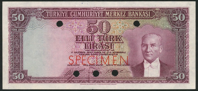 (†) Central Bank of Turkey, specimen 50 Lira, Law of 1930 (1964), no serial numbers, purple on multicoloured underprint, portrait of Kemal Ataturk at right, reverse statue of soldier holding rifle at centre, overprinted SPECIMEN in red on obverse and reverse, five punch holes
