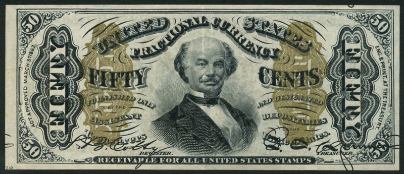 US Fractional series, 25 cents, 1863, black and white, large red seal, George Washington at left, 10 cents, black and white, large red seal, Liberty at left, 50 cents, black and white, small red seal at right, Stanton portrait, all Allison and Spinner signatures, also a 50 cents, black and white with bronze guilloche at left and right, Spinner at centre