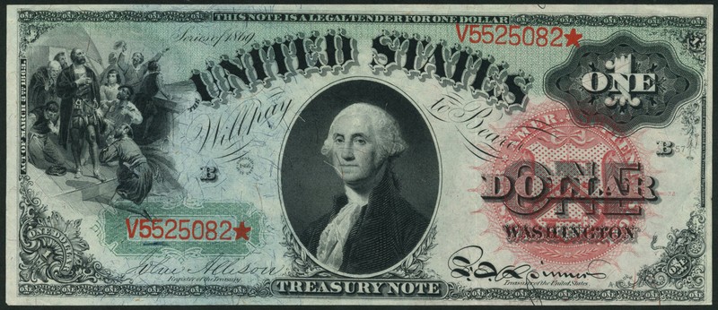 US Treasury note, $1, series of 1869, red serial number V5525082*, black, green and white, George Washington at centre, large red seal at right, Columbus at left, Allison and spinner signatures, reverse green, value