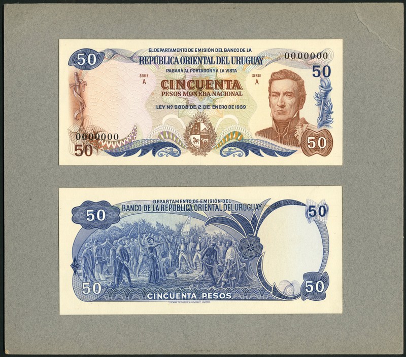 (†) Republica Oriental del Uruguay, an obverse and reverse composite essay, mounted on a single board, for a 50 Pesos, Law of 2 January 1939, zero serial numbers, brown and blue on multicoloured underprint, portrait of Jose Gervasio Artigas at right, arms at lower centre, sword at left, torch at right, reverse blue, group of armed men with flag, value in each corner