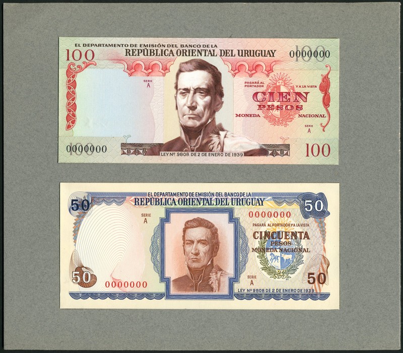 (†) Republica Oriental del Uruguay, obverse composite essays for a 50 Pesos, zero serial numbers, blue and brown on multicoloured underprint and a 100 Pesos, red and brown on multicoloured underprint, both Law of 2 January 1939, zero serial numbers, both Jose Gervasio Artigas at centre, arms at right, value in each corner, both mounted on a single board
