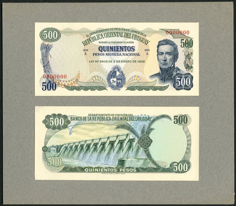 (†) Republica Oriental del Uruguay, an obverse and reverse composite essay, mounted on a single board, for a 500 Pesos, Law of 2 January 1939, red zero serial numbers, blue and sage-green on multicoloured underprint, portrait of Jose Gervasio Artigas at right, arms at lower centre, sheaf of wheat and scythe at left, grape clusters at right, reverse dam, value in each corner