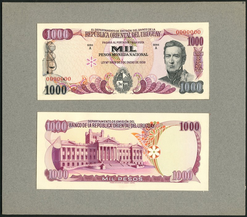 (†) Republica Oriental del Uruguay, an obverse and reverse composite essay, mounted on a single board, for a 1000 Pesos, Law of 2 January 1939, red zero serial numbers, purple and black on pale green and orange underprint, portrait of Jose Gervasio Artigas at right, arms at lower centre, test tubes and chemistry apparatus at left, electricity pylon at right, reverse purple, orange and green, Palacio Legislativo at left centre, value in each corner