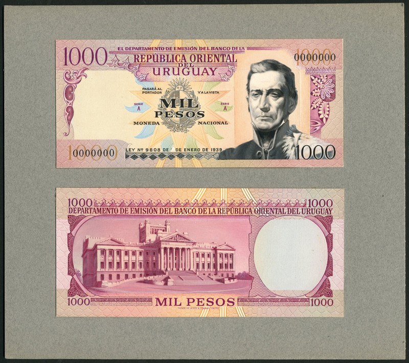 (†) Republica Oriental del Uruguay, an obverse and reverse composite essay, mounted on a single board, for a 1000 Pesos, Law of 2 January 1939, black zero serial numbers, purple, black, pale green and blue on orange underprint, portrait of Jose Gervasio Artigas at right, arms at centre, acanthus leaf scroll at left, floral pattern at right, reverse purple, on orange and pale green underprint, Palacio Legislativo at left centre, value in each corner