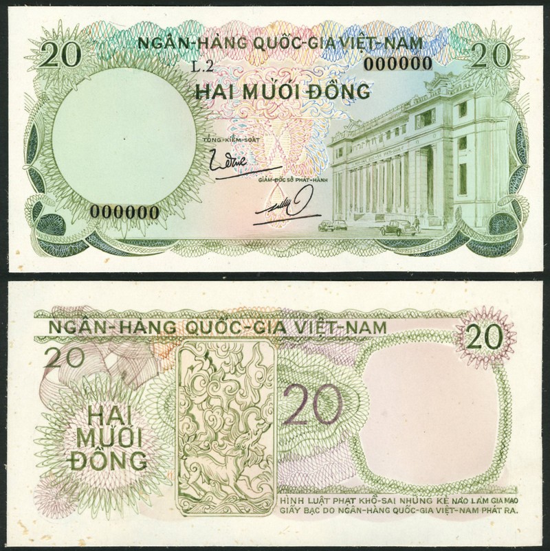 (†) National Bank of Vietnam, an obverse and reverse composite essay on card for a 20 Dong, ND (c1967), serial number 000000, green on pink and blue underprint, National Bank building at right, reverse ornate design of a beast and leaf tendrils at left centre, value at centre and at upper left and right