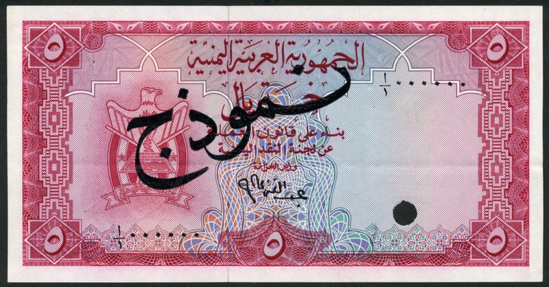 Yemen, Arab Republic, Currency Board, specimen 5 rials ,ND (1964), serial number 1/1 000000, red and multi-coloured, Arms at left, signature 1, reverse red, Lion of Timna