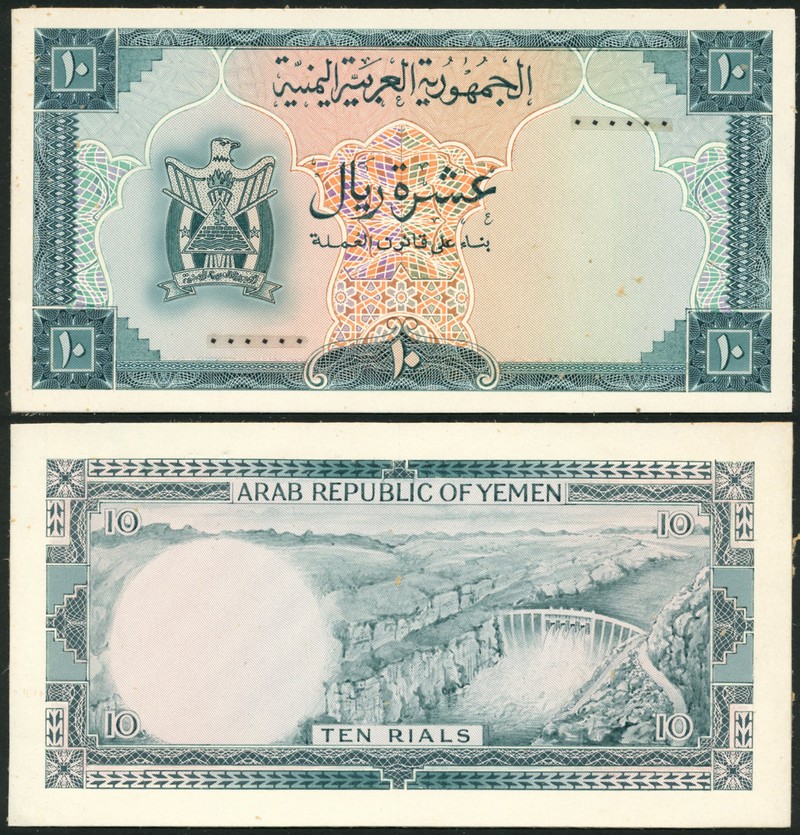 (†) Yemen Currency Board, an obverse and reverse composite essay on card for a 10 Rials, ND (c1964), zero serial numbers, blue-green on multicoloured underprint, arms at left, value in each corner, reverse dam at right
