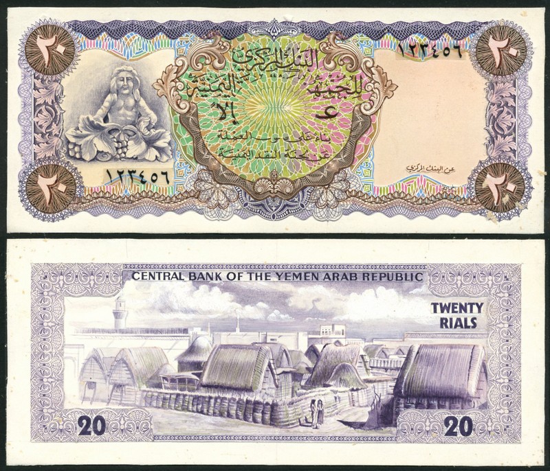 (†) Central Bank of The Yemen Arab Republic, an obverse and reverse composite essay on card for a 20 Rials, ND (c1972), Arabic serial number 123456, brown, violet, green and multicoloured, marble sculpture of seated man with grapes at left, ornate design with acanthus leaves at centre, value in each corner, reverse violet and grey, group of thatched houses at centre, minaret at upper left