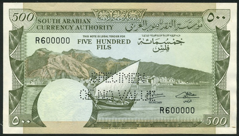 (†) South Arabian Currency Authority, Yemen a specimen proof composite essay for a 500 Fils, ND (c1965), serial number R600000, signature 2, green on multicoloured underprint, vignette of dhow in Aden harbour, reverse "BANK OF YEMEN" at top centre, vignette of date palm and wheat ears at centre left, "ADEN" at lower right, perforated SPECIMEN OF NO VALUE