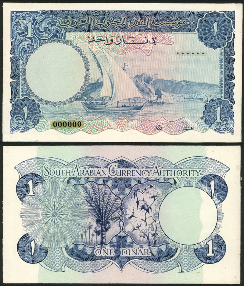 (†) South Arabian Currency Authority, Yemen an obverse and reverse composite essay on card for a 1 Dinar, ND (c1965), zero Arabic and Western serial numbers, dark blue on pink and pale blue underprint, view of Aden harbour, dhow with two sails at left centre, ornate acanthus leaved scroll at upper left, value in all four corners, reverse date palms at left, cotton plant at right