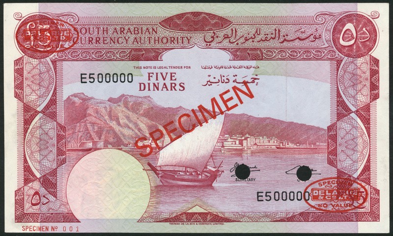 (†) South Arabian Currency Authority, Yemen a group of specimens of the ND (1965) Issue, all zero serial numbers, signature 2, all dhow in Aden harbour, reverse date palm, comprising 250 Mils, prefix A7, brown; 500 Mils, prefix X7, green; 1 Dinar, prefix V5, blue; 5 Dinars, prefix E5, red; also Bank of Yemen, specimen 1 Dinar, blue and 5 Dinars, red, both ND (1984), zero serial numbers, signature 3, dhow, reverse date palm, all overprinted SPECIMEN in red with two De La Rue specimen ovals on obverse and reverse