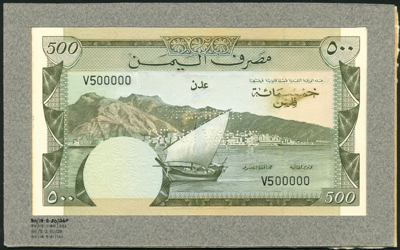 (†) Bank of Yemen, a specimen obverse proof composite essay on board for a 500 Fils, ND (c1980), serial number V500000, no signatures, green on multicoloured underprint, vignette of dhow in Aden harbour, value in Western and Arabic numerals in each corner, perforated SPECIMEN OF NO VALUE