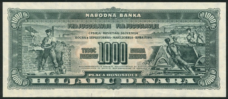 Narodna Bank of Yugoslavia, a partially printed proof 1000 dinara, type of 1949, obverse background tint only, reverse dark green, sone msons and factory workers, text different from previous note, HILJADU DINARA in large text below