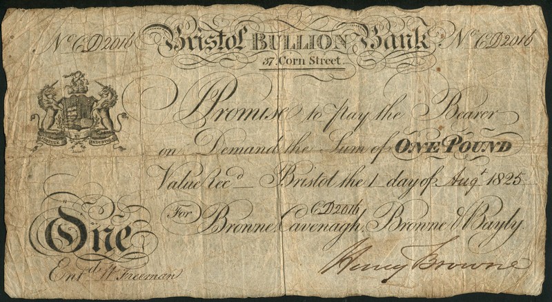 Bath Old Bank, £5, 1841, Bristol Bullion Bank, £1, 1825 and Kingsbridge Bank, £1, 1825