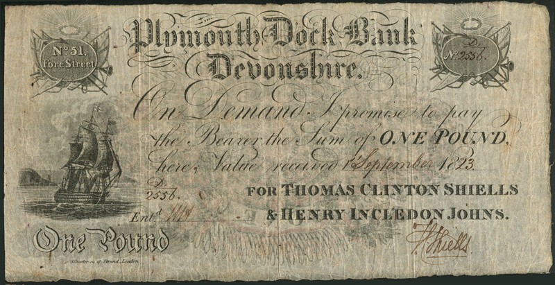 Bath Old Bank (Hobhouse, Phillett & Lowder), £5, 1841, serial number F4619, arms at top left, also Plymouth Dock Bank (Thomas Clinton Shiells & Henry Incledon Johns), £1, 1823, serial number D/2556, warship at left, and Chipping Norton Bank (Corgan, Paget & Matthews), £1, 1816, serial number 1583, castle at left