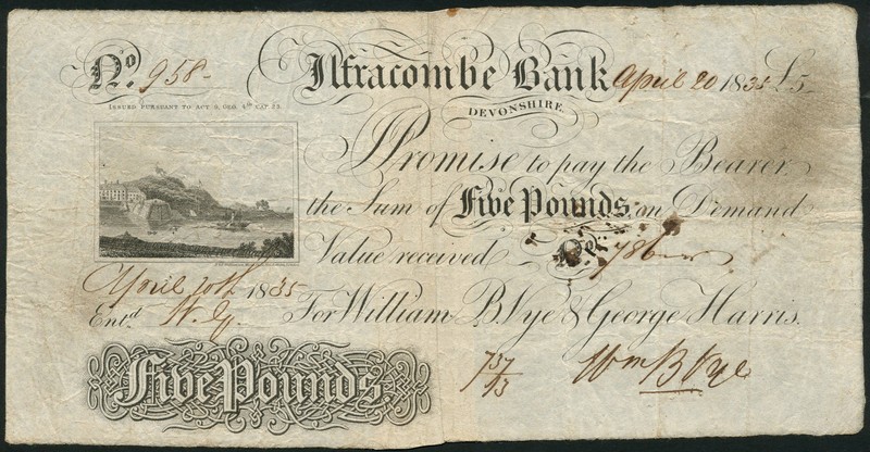 Ilfracombe Bank (William B.Vye & George Harris), £5 (2), 20 April 1835, both with two non-matching halves rejoined to make an illegal note, black and white, vignette of Ilfracombe harbour at left, value in tablet at low left, manuscript signature of William Vye at low right