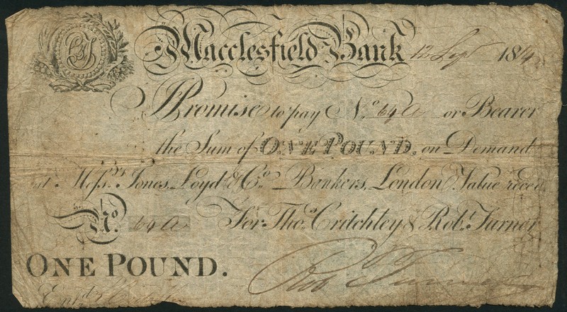 Macclesfield Bank (Thos. Critchley & Robt. Turner), £1, 12 September 1814, serial number 64a, black and white, arms top left