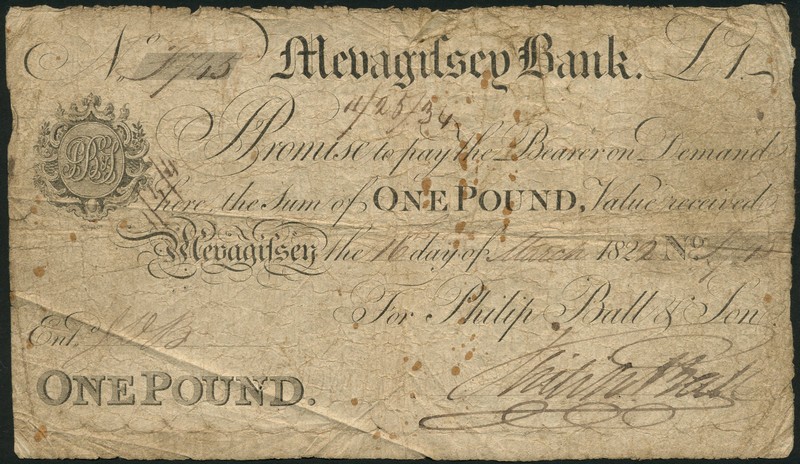 Mevagissey Bank (Philip Ball & Son), £1 (2), 1822,1824, black and white, arms at left