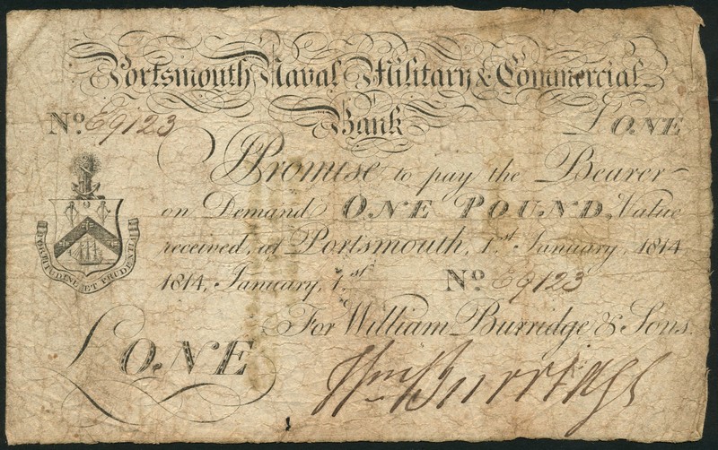 Portsmouth Naval, Military and Commercial Bank (William Burridge & Sons), £1, 1 January 1814, serial number E 9123, black and white, arms at left