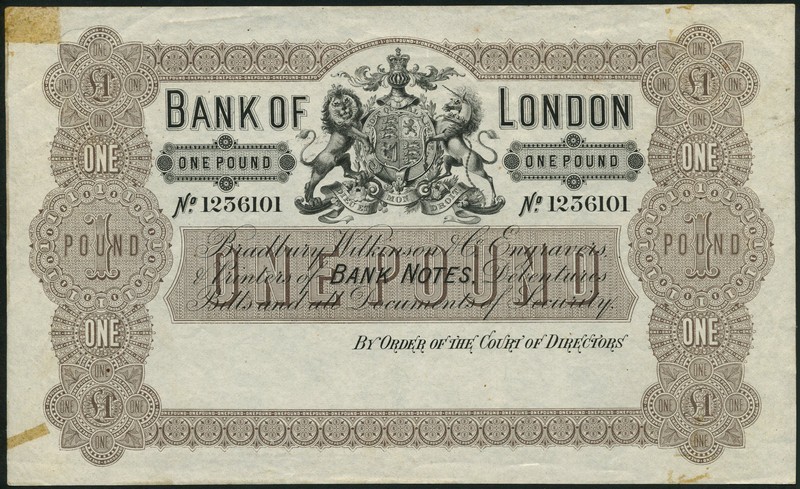 Bank of London, £1, ND (ca 1880), serial number 1236101, brown, black and white, crowned arms top centre flanked by a lion and unicorn