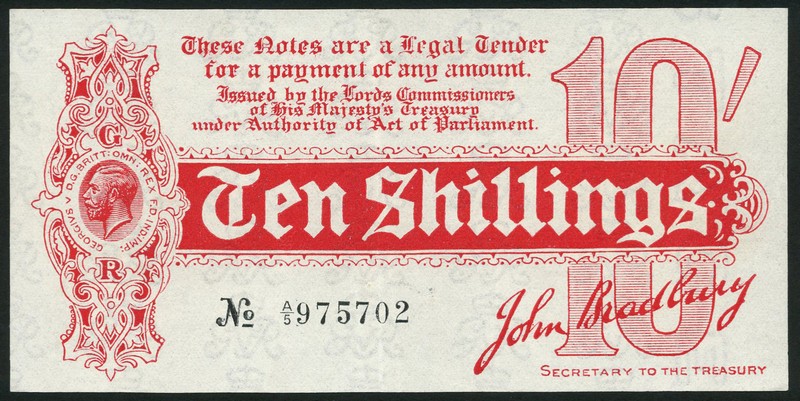 Treasury series, John Bradbury, 10/-, ND (14 August 1914), serial number A/5 975702, red, George V at elft, value at right and in red tablet at centre