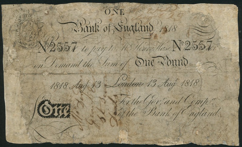 Bank of England, Henry Hase, £1, 13 August 1818, serial number 2557, black and white, crowned vignette of Britannia at top left, value in black tablet at low left
