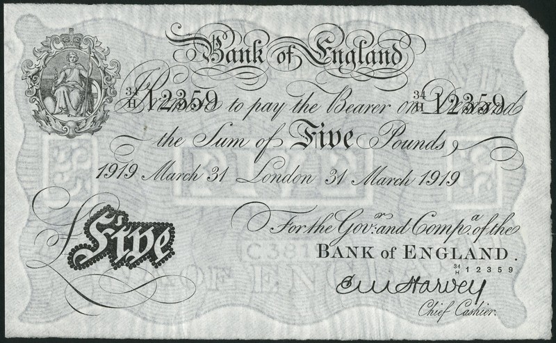 Bank of England, E.M.Harvey, £5, 31 March 1919, serial number 34/H 12359, black and white, crowned vignette of Britannia at top left, value in black tablet at low left