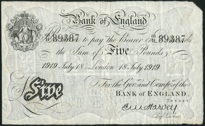 Bank of England, E.M.Harvey. £5, 18 July 1919, serial number 68/H 89387, black and white, crowned vignette of Britannia at top left, value in black tablet at low left