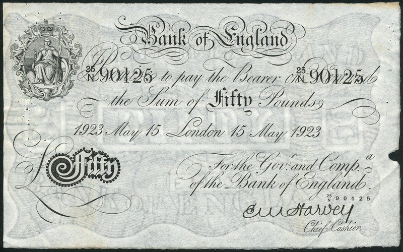 Bank of England, E.M.Harvey (1918-1925), £50, London, 15 May 1923, serial number 25/N 90125, black and white, ornate crowned vignette of Britannia top left, value in black tablet low left