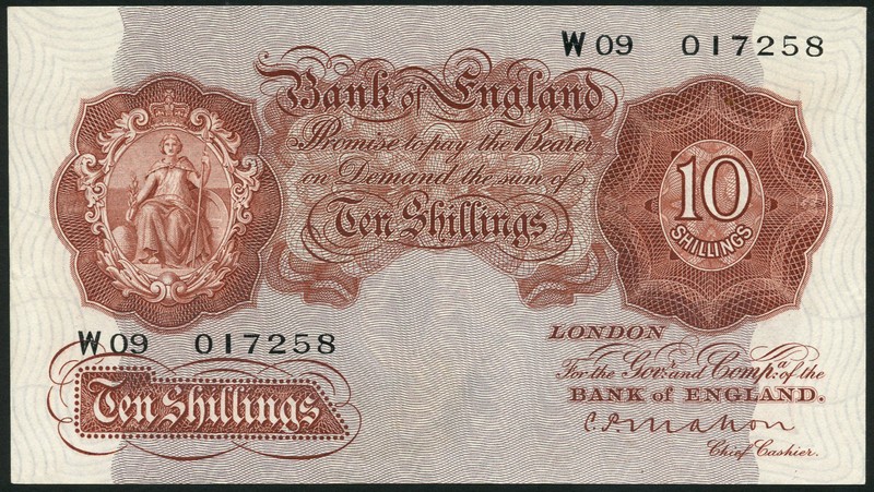 Bank of England, C.P.Mahon, 10/-, ND (1928), serial number W09 017258, red-brown, Britannia at left, value at right