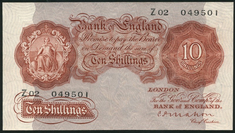 Bank of England, C.P.Mahon, 10 shillings, serial number Z02 049501, brown, Britannia at left, value at right