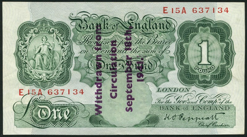 Bank of England, K.O.Peppiatt, £1, Guernsey overprint, serial number E/15A 637134, green, Britannia at top left, value at top right and in tablet at low left, type B overprint on obverse and reverse