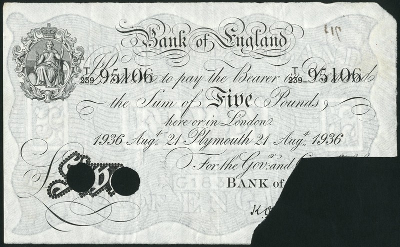 Bank of England, K.O.Peppiatt, £5, Plymouth, 21 August 1936, serial number T/239 95106, black and white, crowned vignette of Britannia at top left, value in black tablet at low left