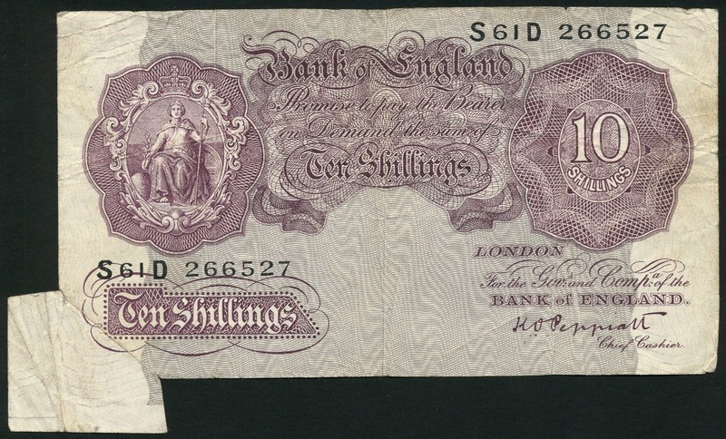(x) Bank of England, K.O.Peppiatt, 10/-, ND (1940), serial number S61D 266527, mauve on grey underprint, Britannia at top left, value at bottom left and top right, extra paper fin at low left