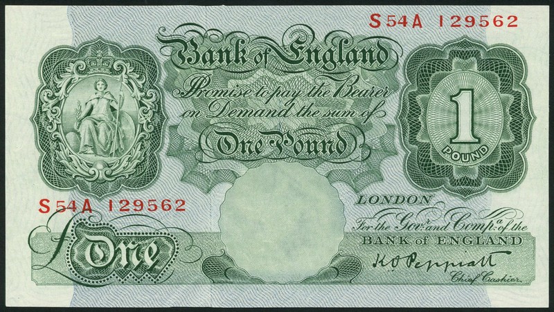 Bank of England, K.O.Peppiatt, £1, ND (1948), serial number S54A 129562, green, Britannia at top left, value at top right and low left
